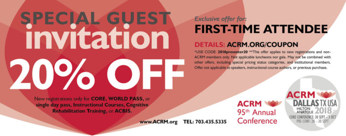 This offer applies to new registrations only for CORE, WORLD PASS, or single day pass; Instructional Courses, Cognitive Rehabilitation Training, or ACBIS. Offer applies to new registrations and non-ACRM members only. It is not applicable to luncheons or gala, and may not be combined with other offers, including special pricing status categories and institutional members. Offer is not applicable to speakers, Instructional Course authors, or previous purchases.
