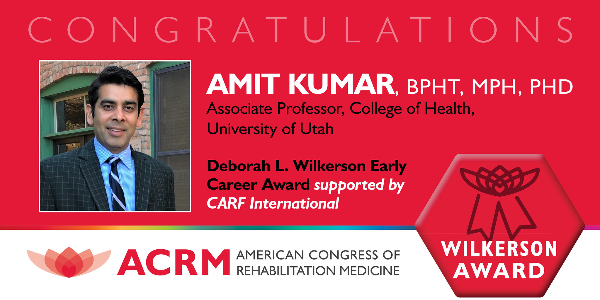 The Awards Committee is pleased to honor Amit Kumar, BPHT, MPH, PhD with the 2023 Deborah L. Wilkerson Early Career Award supported by CARF International. This award recognizes the significant contributions he has made to rehabilitation research during her early career work.