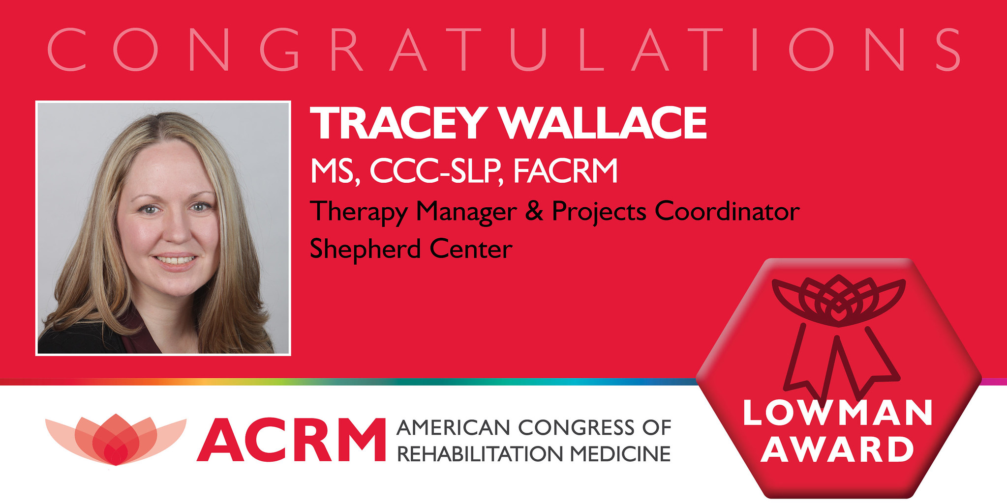 ACRM is pleased to honor Tracey Wallace, MS, CCC-SLP, FACRM with the 2025 Edward Lowman Award. This award will be presented during the ACRM 2025 Annual Conference.