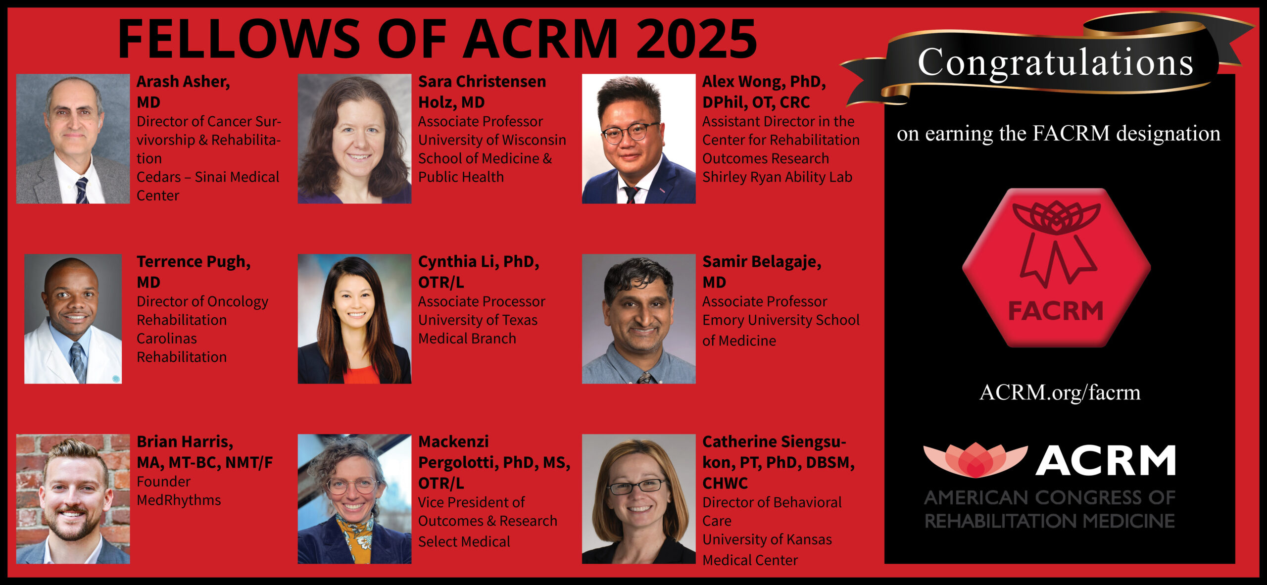 The Fellow of ACRM designation recognizes active members with an outstanding record of professional service to ACRM who have also made contributions of national significance to the field of medical rehabilitation. Fellows may use the designation “FACRM” after their name to identify this achievement.