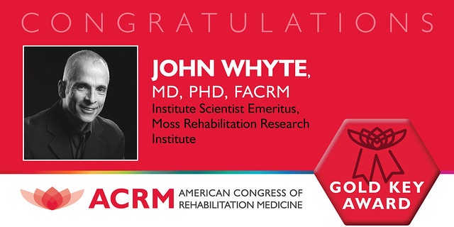 The ACRM Awards Committee and Board of Governors are proud to honor John Whyte, MD, PhD, FACRM with the ACRM Gold Key Award for his lifetime achievements. It is the highest honor awarded by ACRM.