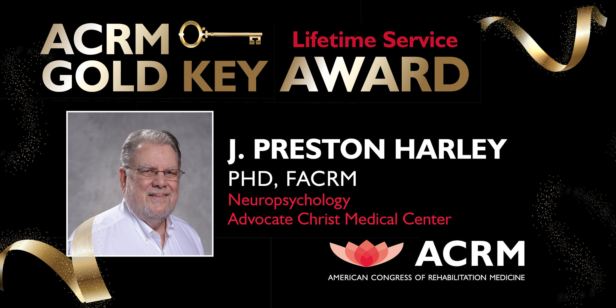 The ACRM Awards Committee and Board of Governors proudly honored J. Preston Harley, PhD, FACRM with the 2023 ACRM Gold Key Award in recognition of his lifetime achievements. This award was established in 1932 as a certificate of merit for members of the medical and allied professions who had rendered extraordinary service to the cause of rehabilitation. It is the highest honor given by ACRM.
