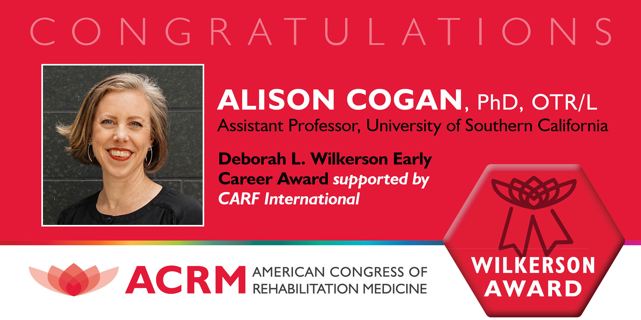 ACRM is pleased to honor Alison Cogan, PhD, OTR/L with the 2024 Mitchell Rosenthal Mid-Career Award in recognition of her leadership and contributions to the field of brain injury rehabilitation research.