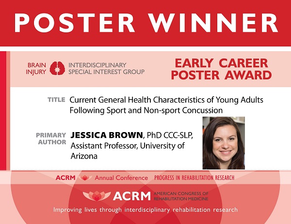 This award is given to a researcher in the first 10 years of his or her career, who is first author of a poster in the area of brain injury exhibited at the annual conference and judged on its merits across several areas of topic relevance and importance, research methodology, coherence, writing quality, and overall presentation.
