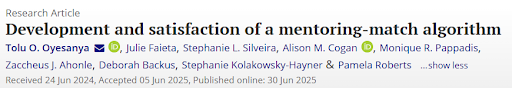 Congratulations to the CDNG Mentoring Task Force for the publication titled “Development and satisfaction of a mentoring-match algorithm,” co-authored by Drs. Oyesanya, Faieta, Silveira, Cogan, Pappadis, Ahonle, Backus, Kolakowsky-Hayner and Roberts. This study aimed to describe the development, implementation, and user satisfaction of a mentoring match algorithm designed for the ACRM Career Development Networking Group (CDNG) Leadership Mentoring Program. A sequential, mixed-methods evaluation was conducted to assess the algorithm’s effectiveness. The authors found that this innovative, interdisciplinary mentoring match algorithm demonstrates strong potential for broader application across disciplines, settings, and organizations.