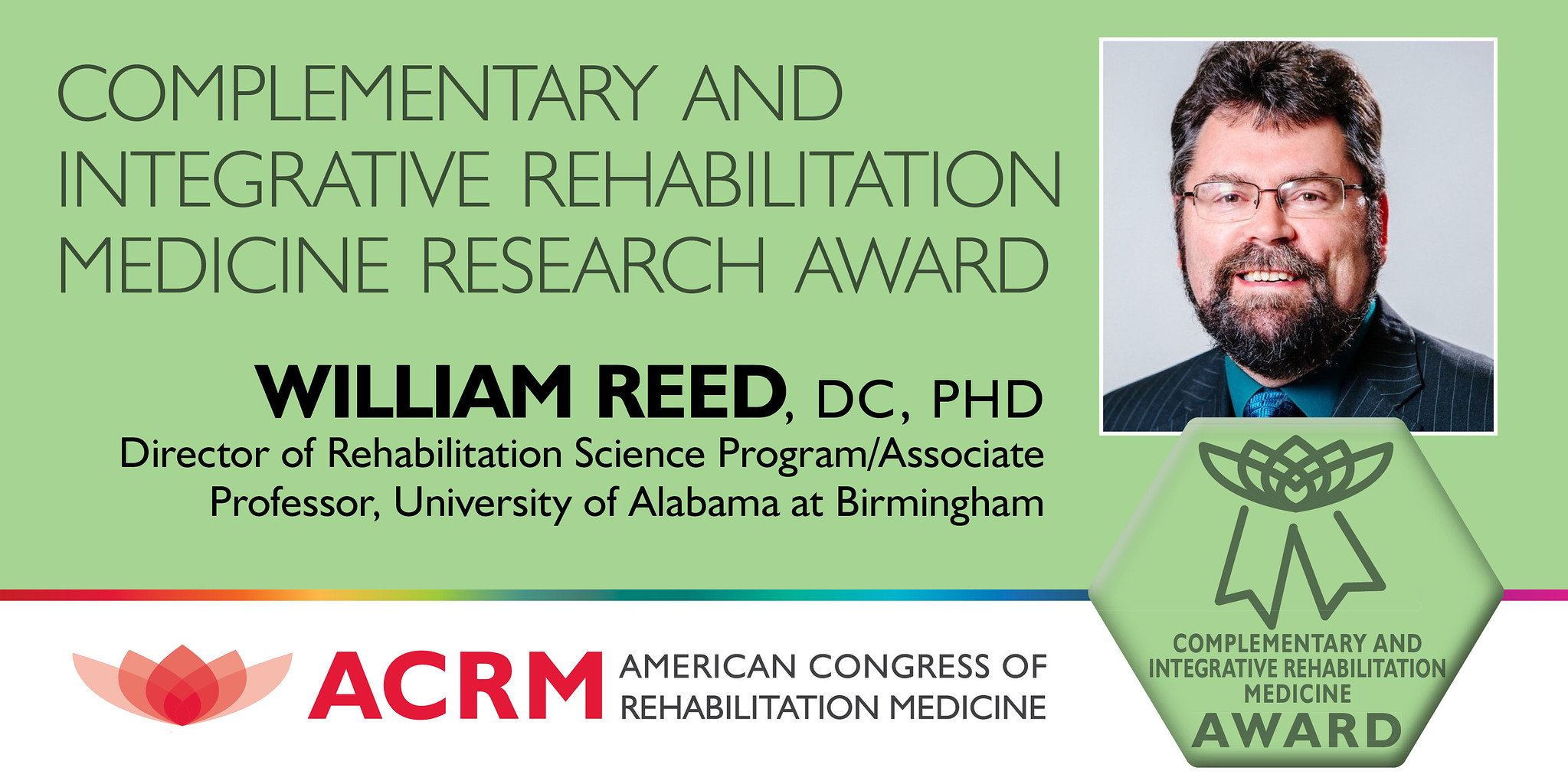 Congratulations to William Reed, DC, PhD, the inaugural recipient of the Excellence in CIRM Research Award. This award recognizes an outstanding researcher who has demonstrated scientific excellence regarding the use and integration of complementary, holistic and integrative health approaches related to important rehabilitation medicine areas including healthcare, education and policy.