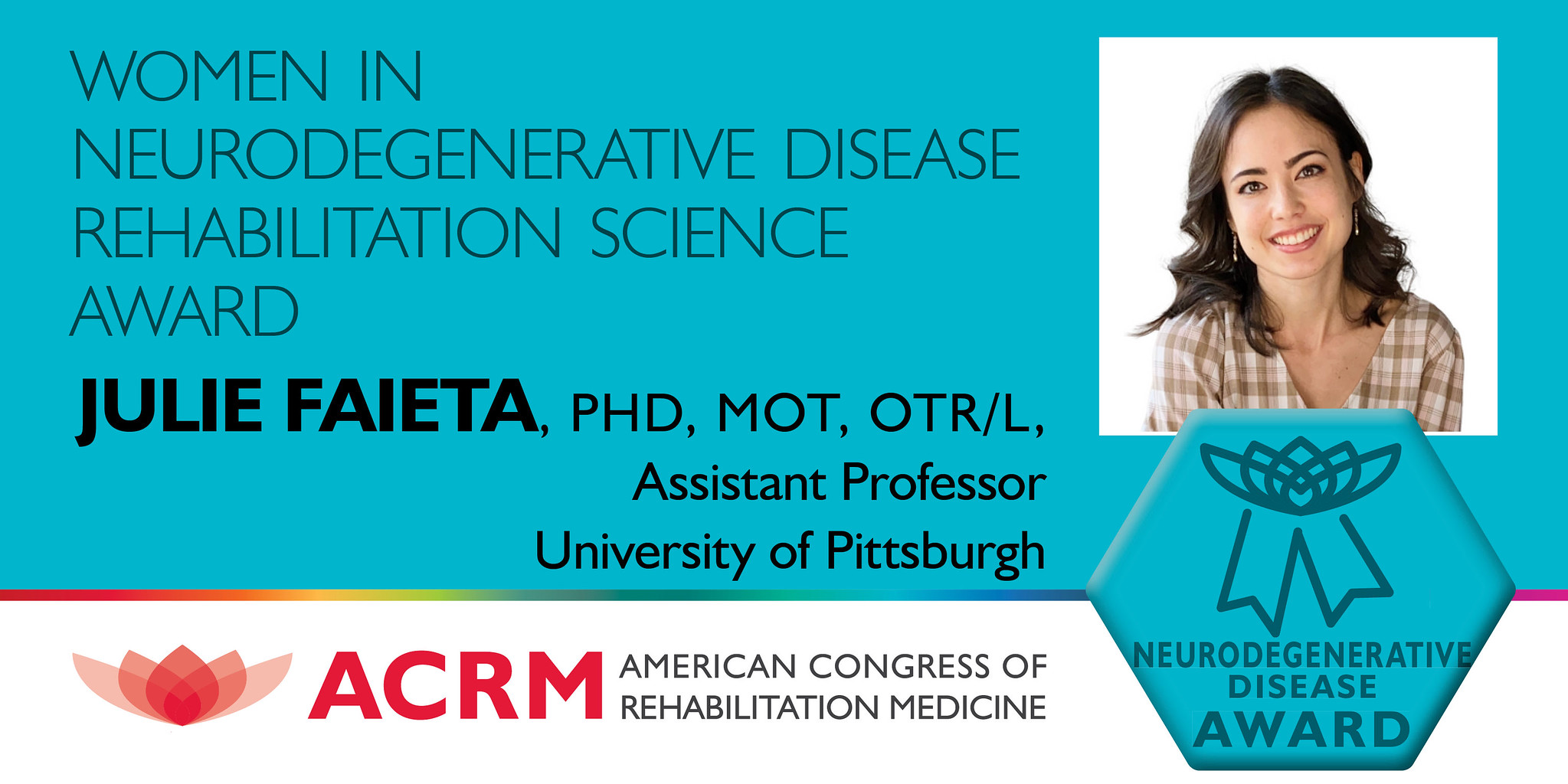 Please join us in congratulating Julie Faieta, PhD, MOT, OTR/L, the recipient of the 2023 Women in Neurodegenerative Disease Rehabilitation Science Award. This award was established in 2018 to acknowledge world-class rehabilitation research conducted by a female scientist in the rehabilitation research field of multiple sclerosis, amyotrophic lateral sclerosis, Parkinson’s, dementia, Alzheimer’s or related neurodegenerative disease. It will be presented to Dr. Goldman during the ACRM 2023 Annual Conference.