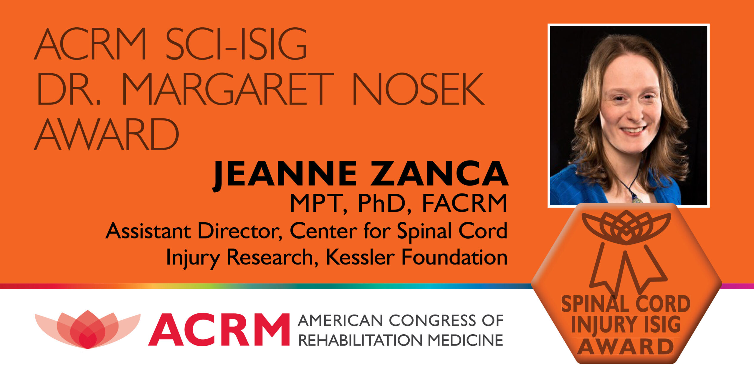 Please join ACRM in congratulating Jeanne Zanca, MPT, PhD, FACRM selected by the SCI-ISIG Executive Committee as the recipient of the SCI-ISIG Dr. Margaret Nosek Award. The award recognizes an individual who demonstrates drive and commitment to advancing scientific knowledge, developing standards of clinical practice, raising awareness, and advocating for appropriate health care and community support for women with disabilities.
