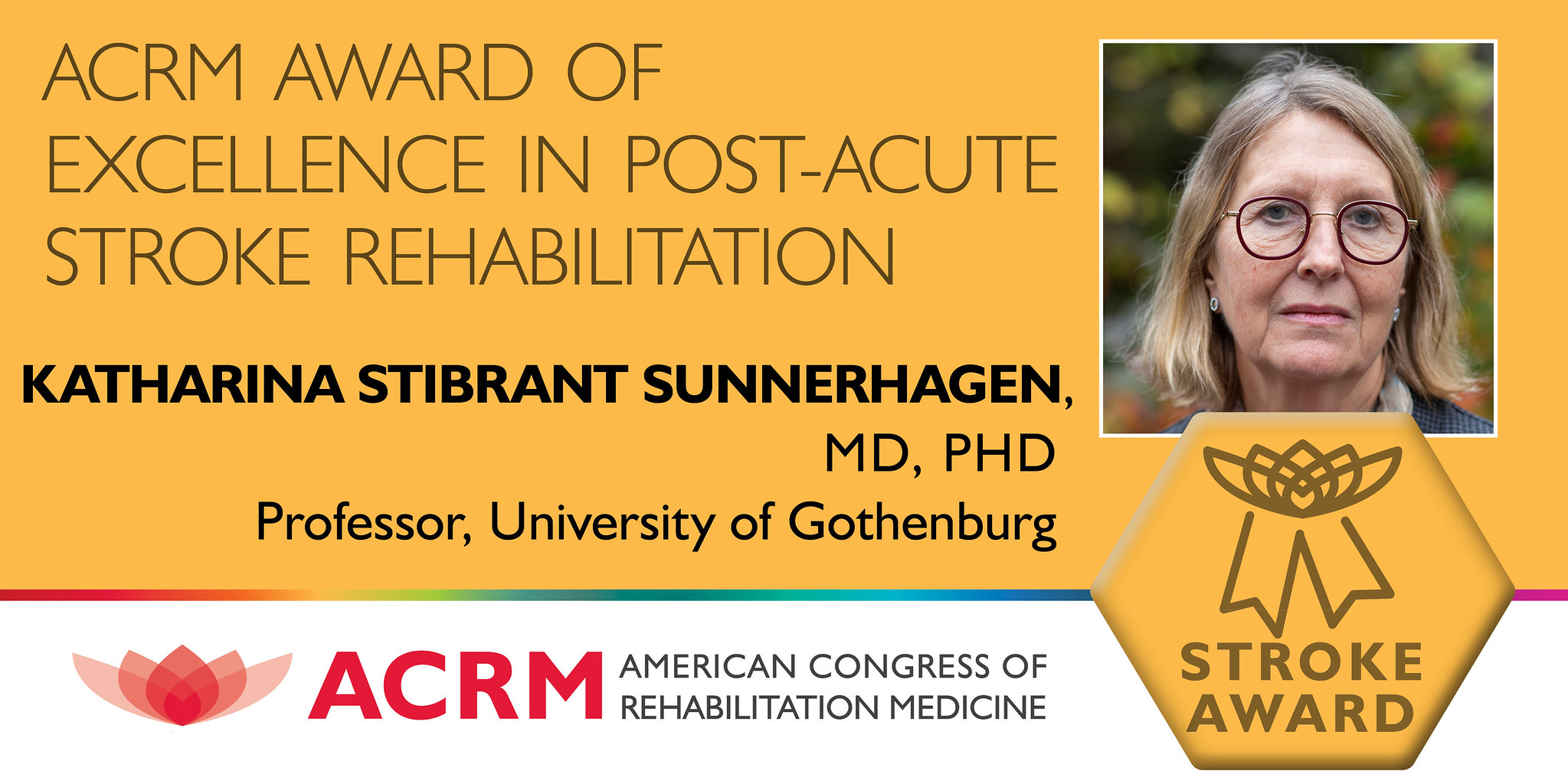 Congratulations to Katharina Stibrant Sunnerhagen, MD, PhD the 2023 recipient of the ACRM Award of Excellence in Post-Acute Stroke Rehabilitation. This award lectureship recognizes outstanding clinical, intellectual, and service contributions in the area of stroke.