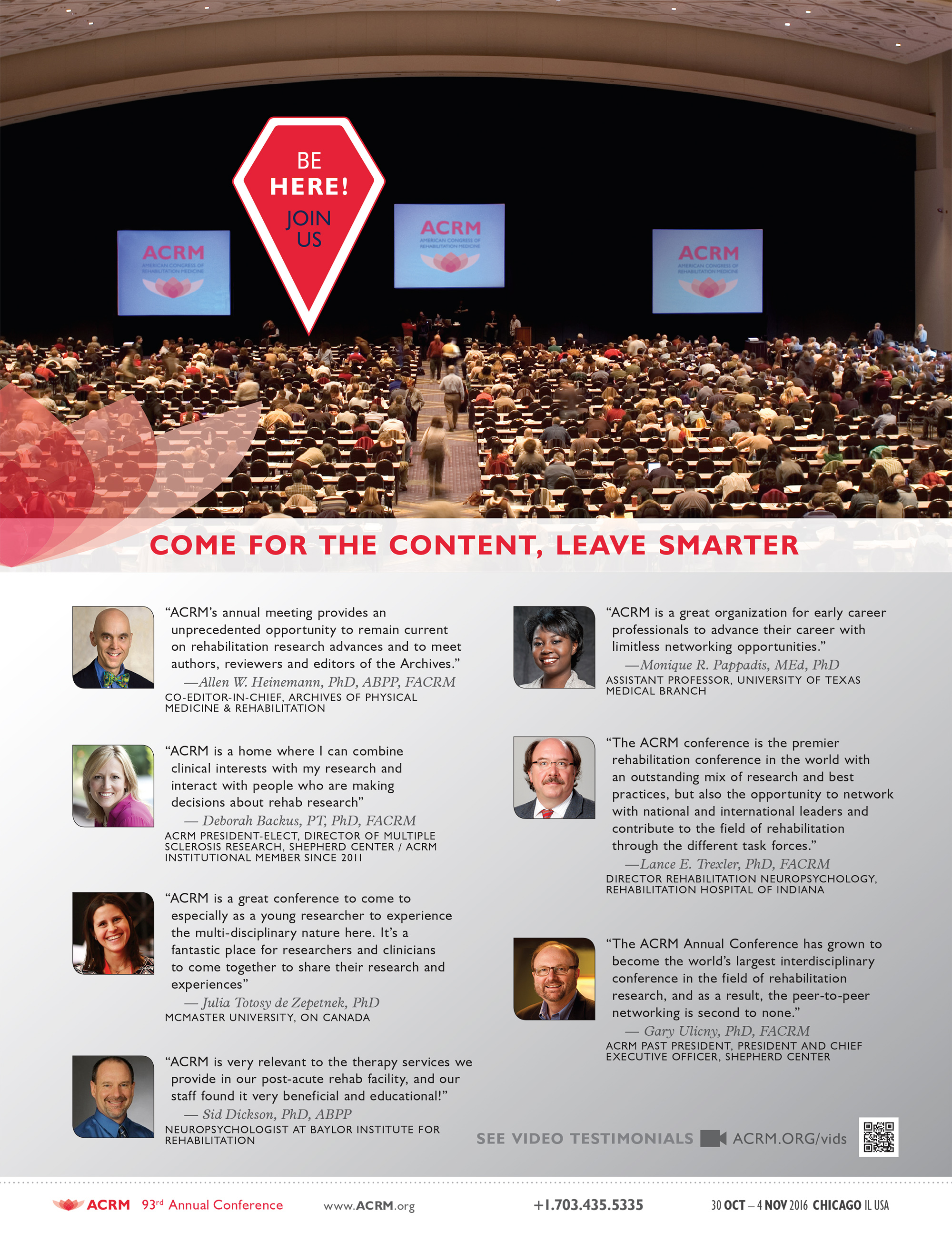 “ACRM’s annual meeting provides an unprecedented opportunity to remain current on rehabilitation research advances and to meet authors, reviewers and editors of Archives.”—Allen W. Heinemann, PhD, ABPP, FACRM, Co-Editor-in-Chief, Archives of Physical Medicine & Rehabilitation |
