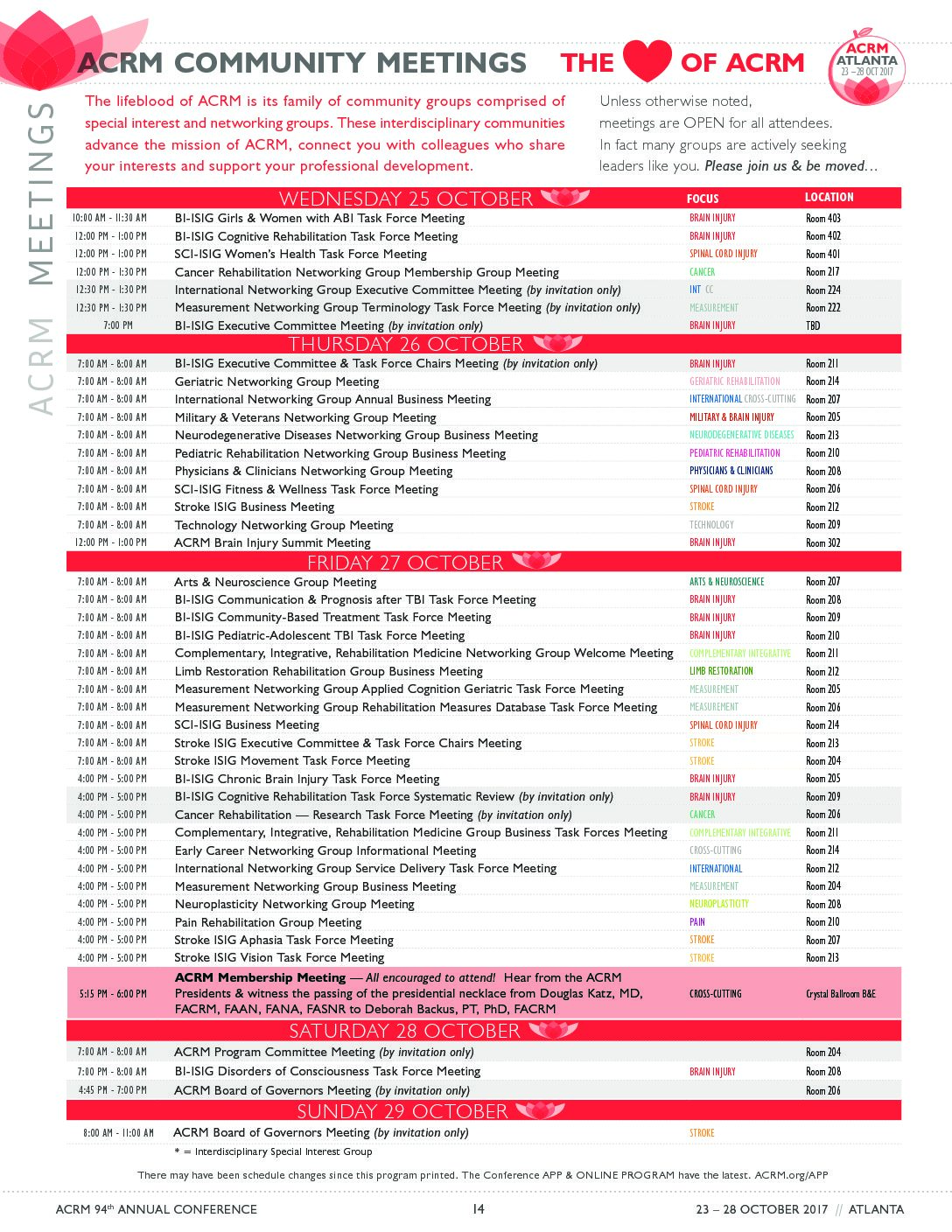 See the list of Community Meetings in the Online Program & Scheduler CLICK HERE >> for the latest & for the room locations