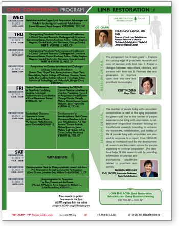 For specific LIMB LOSS REHABILITATION sessions and more details (including presenters, session descriptions and schedules) see the ACRM APP and the online program.