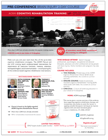 INCLUDES: Two days of live training, The Manual (printed copy of the ACRM Cognitive Rehabilitation Manual ($150 Value), CME/CEUs: 12.5 Continuing Education credits in your choice of 10 disciplines, Online Course: 1 year access to a previously recorded Cognitive Rehabilitation Training ($395 value)