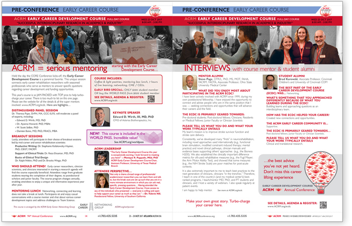 Held the day the CORE Conference kicks-off, the Early Career Development Course is a perennial favorite. This unique session connects early career rehabilitation researchers with seasoned professionals who serve as mentors to answer specific questions regarding career development and funding opportunities.