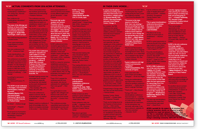With a collegial harmonious atmosphere, rare in mega-medical conferences, ACRM functions as powerful “glue” that joins together professionals from all specialty areas and disciplines for intellectual exchange and improved rehabilitative outcomes.