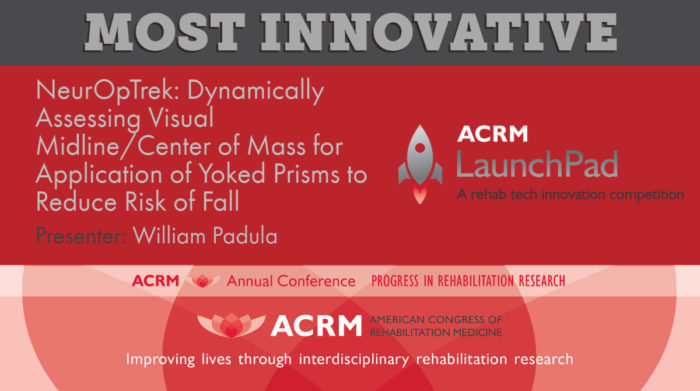 Presenters: Nathan Hogaboom and Marc Gruner - Most Innovative: NeurOpTrek: Dynamically Assessing Visual Midline/Center of Mass for Application of Yoked Prisms to Reduce Risk of Fall