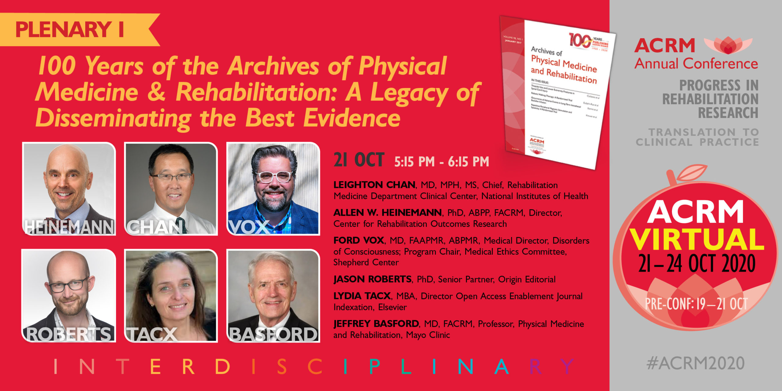 This one-hour plenary session will celebrate the 100th anniversary of the Archives of Physical Medicine and Rehabilitation. We will discuss trends in manuscript topics and authorship, and identify key events and landmark papers over the past century. We will summarize the evolution of contemporary medical and scientific publishing and how these trends affect Archives and ACRM. Following this didactic presentation, key opinion leaders will participate in a roundtable discussion and anticipate the future of medical publishing. Potential panelists include Christine Rullo, Publisher and Vice President, American Association for Cancer Research, Inc.; Jason Roberts, Senior Partner, Origin Editorial; Helen Hoenig, deputy editor, Archives of Physical Medicine and Rehabilitation; Jeff Basford, editor-in-chief, Archives of Rehabilitation Research and Clinical Translation, and a representative of Elsevier, Archives’ publisher. We will invite Ford Vox, Archives’ RehabCast editor, to moderate the panel discussion. The remaining time will be devoted to questions from plenary attendees.