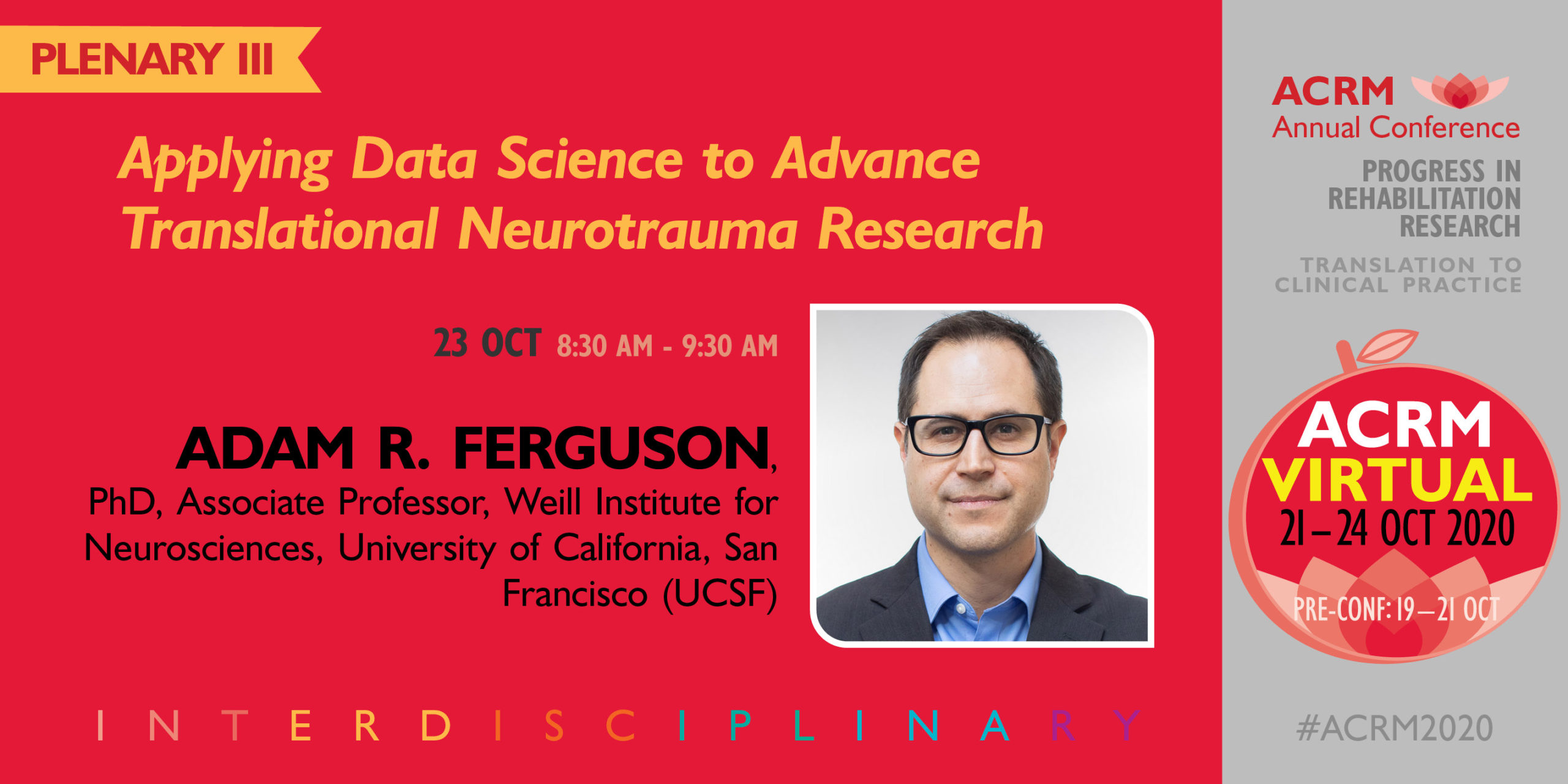 In this Plenary, Dr. Adam Ferguson will share his innovative work at the interface of data science and neurotrauma, including VISION-SCI, a community data repository, that hosts subject-level data from over 4000 rodents with SCI and Open Data Commons for SCI (odc-sci.org) and TBI (odc-tbi.org), a cloud-based data infrastructure designed to accelerate progress in pre-clinical SCI and TBI research through data sharing and re-using. His current work in large-scale clinical projects will also be discussed, including a multicenter prospective Transforming Research and Clinical Knowledge in Traumatic Brain Injury (TRACK-TBI) and SCI (TRACK-SCI) studies, and TBI Endpoints Development (TED) Initiative.