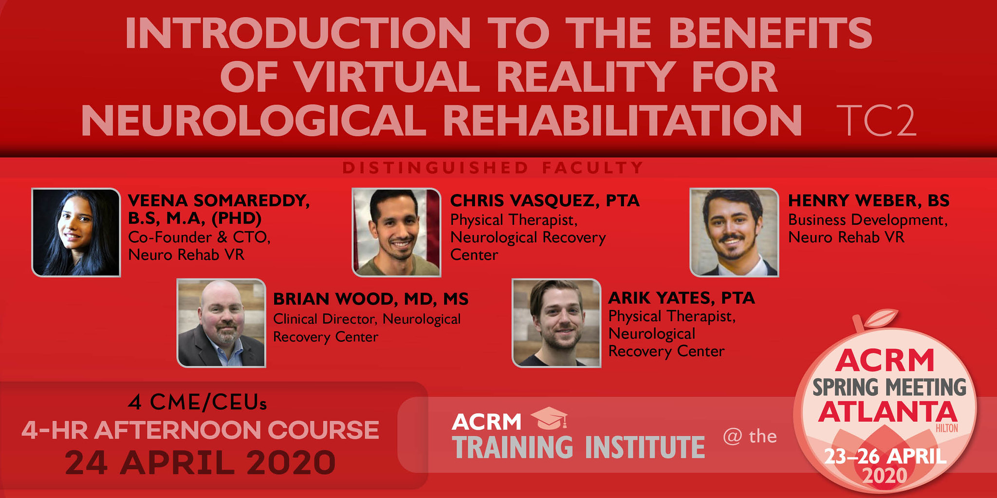 PRESENTER’S STATEMENT: “I’m excited to be presenting a novel course about virtual reality for rehabilitation at ACRM. You will learn the benefits of virtual reality for patient engagement, motivation and outcomes and learn how to integrate it as part of your therapy plan. This will help you and your team stay current on the cutting edge technology that will be the future of physical therapy. You will become the rock star of virtual reality who knows it all beyond reality.” —Veena Somareddy, B.S, M.a, (Phd)