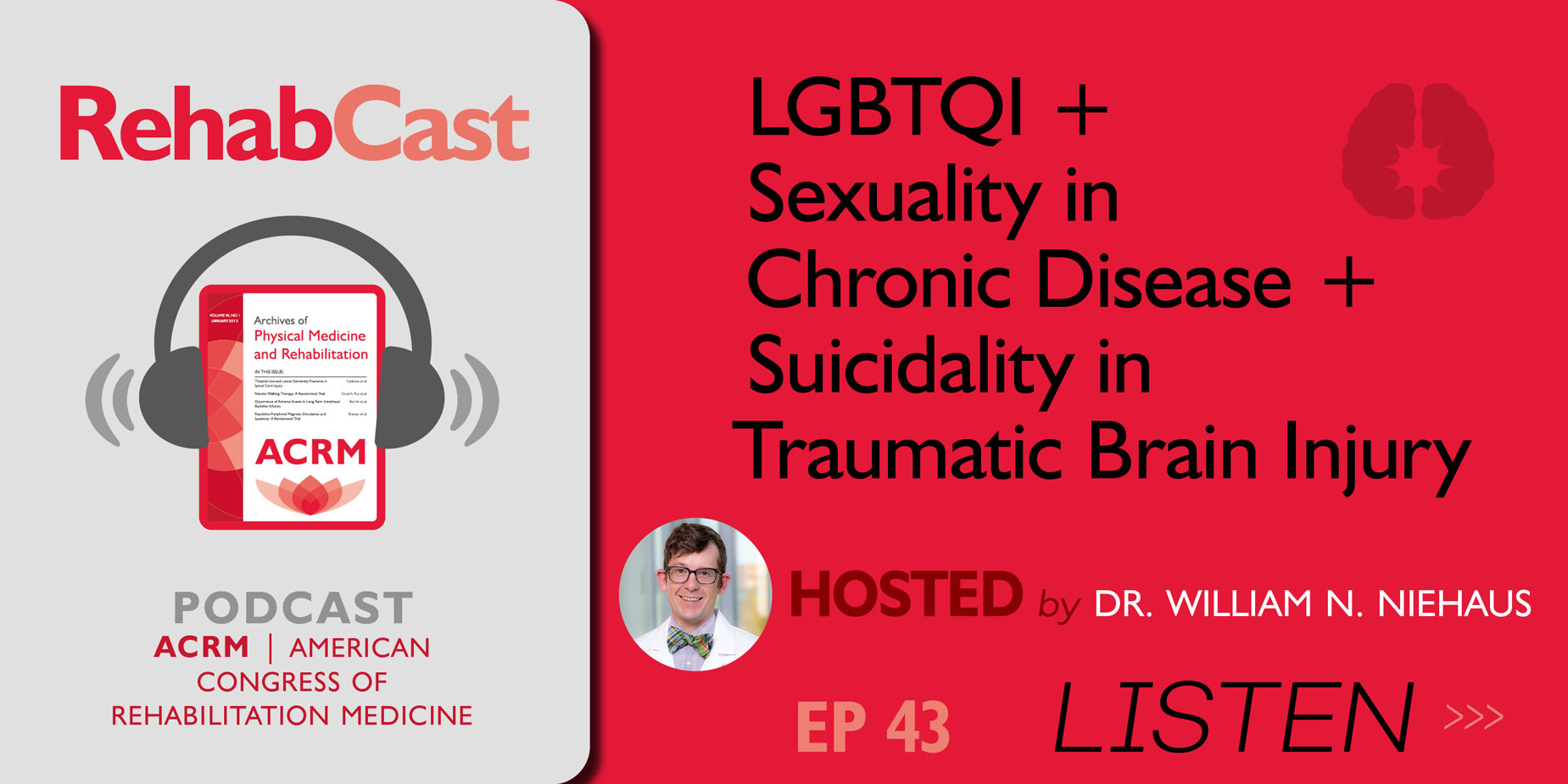 In this episode, Dr. Bill Niehaus takes over as host from Dr. Ford Vox. Dr. Niehaus interviews William Kokay, BSW about his paper “Mixed Study Systematic Review and Meta-analysis of Sexuality and Sexual Rehabilitation in LGBTQI+ Adults Living With Chronic Disease”. Dr. Niehaus then welcomes Dr. Sheryl Katta-Charles who talks about her study “Depression, anxiety, and suicidality in individuals with chronic traumatic brain injury before and during the COVID-19 pandemic: A NIDILRR TBI Model Systems Study”. #RehabCast is the PM&R podcast for all of rehabilitation medicine: physiatry, occupational therapy, physical therapy, speech language pathology, neuropsychology, rehabilitation nursing and more